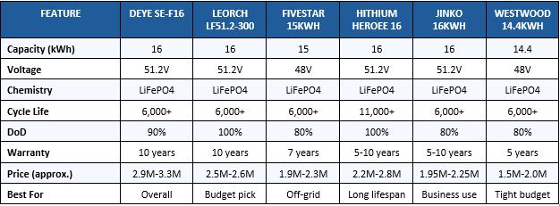 - Best budget LiFePO4: Leorch LF51.2-300 at NGN 2.5 to 2.6 million. Grade A cells, 100% DoD, and a 10-year warranty at a price that undercuts the Deye significantly.