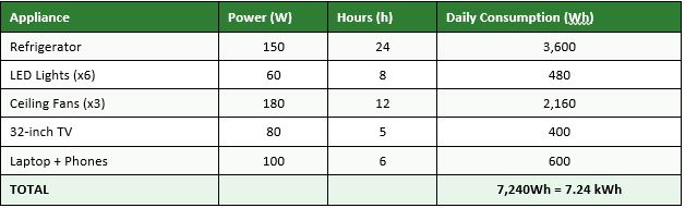 A typical Nigerian three-bedroom flat running a refrigerator, a television, fans, lights, and a phone-charging setup for 12 hours will consume approximately 5 to 8 kWh per day.