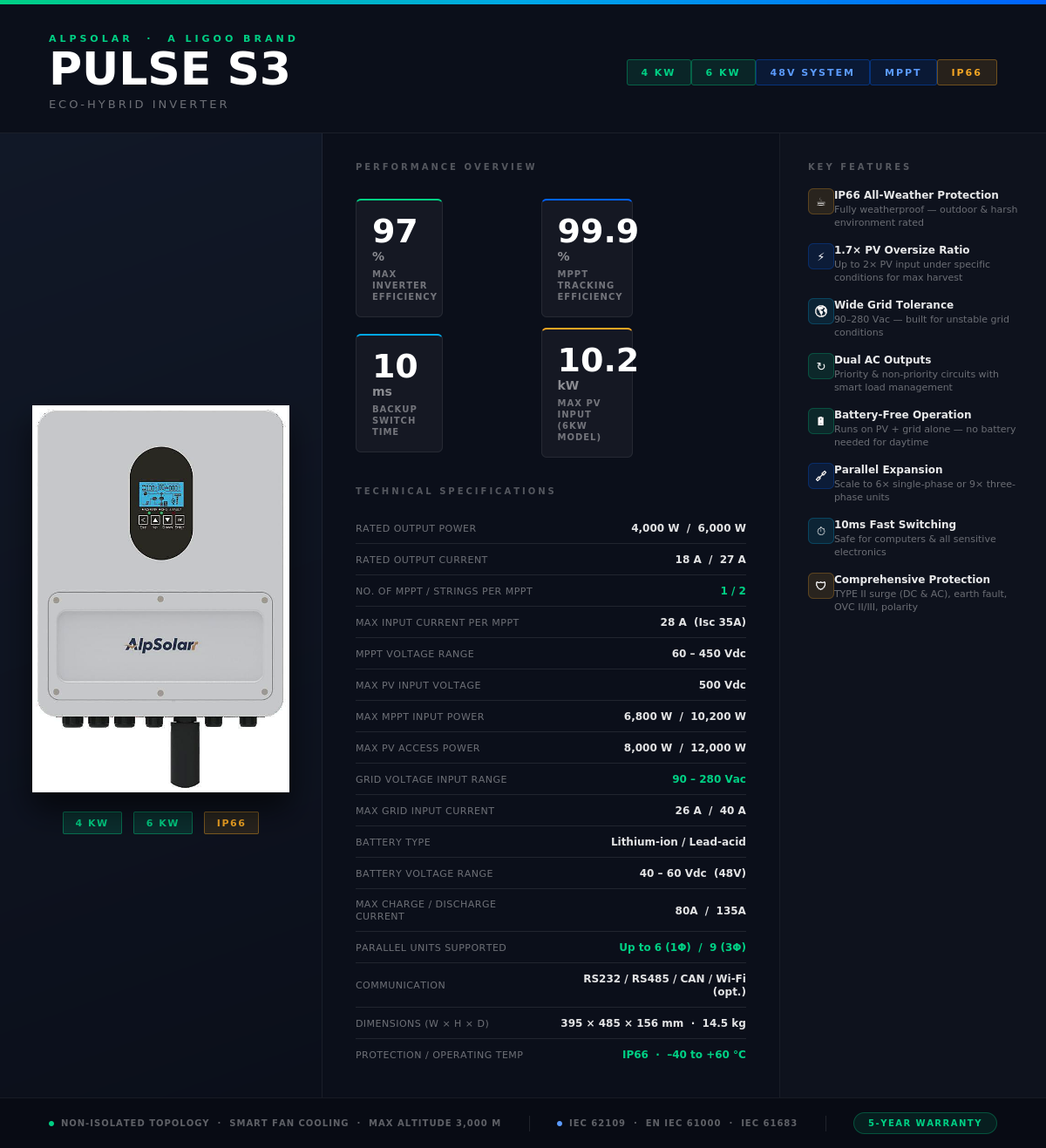 The Alpsolar Pulse S3 6kW Hybrid Inverter is a powerful and intelligent solar energy management system designed for modern homes, offices, and small commercial solar installations in Nigeria.